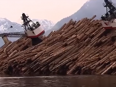 重達3000噸的木材卸載只需要把船傾斜,瞬間完成!